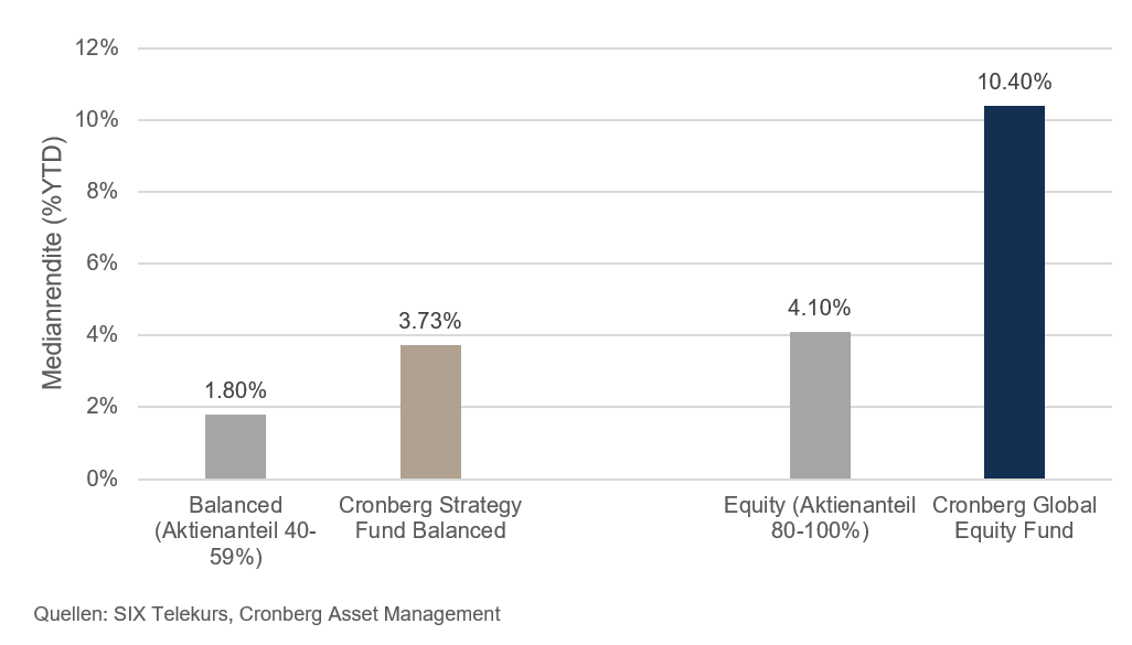 Diese Selektion hat massgeblich dazu beigetragen, dass sowohl der Cronberg Strategy Fund Balanced als auch der Cronberg Global Equity Fund weiterhin sehr erfreulich abschneiden. Beide Fonds übertreffen die Medianrendite der in der Schweiz zum Vertrieb zugelassenen Anlagefonds mit der entsprechenden Strategie deutlich.